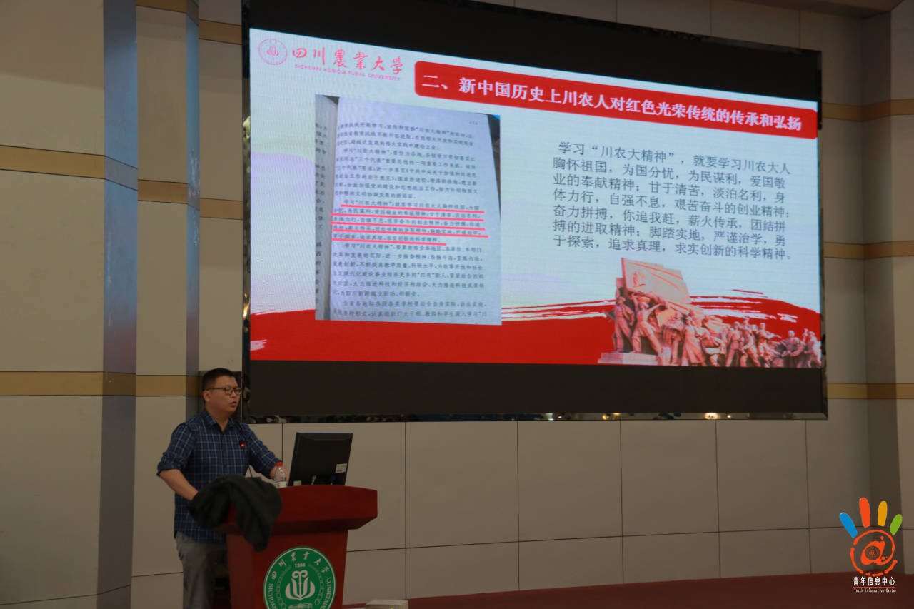 10月22日下午,由校团委举办的“青年讲师团”启动仪式暨团团大讲堂第一讲——“川农大红色光荣传统”在雅安校区逸夫楼小礼堂举行,学校档案馆馆长潘坤应邀担任主讲嘉宾。