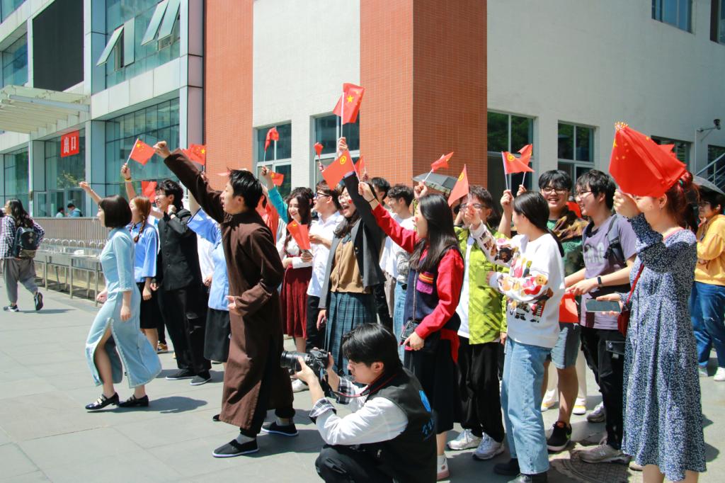 在快闪活动现场,很多同学手拿五星红旗,随着音乐挥舞,现场呈现一片红色的波浪,两校区的快闪在同一时间共同唱响出川农学子的青春赞歌。现场一位动物科技学院的同学观看完表演表示,“他们唱得太好听了,感觉歌声唤醒了我内心深处的梦想,也让我想起了自己来到学校的初心。”