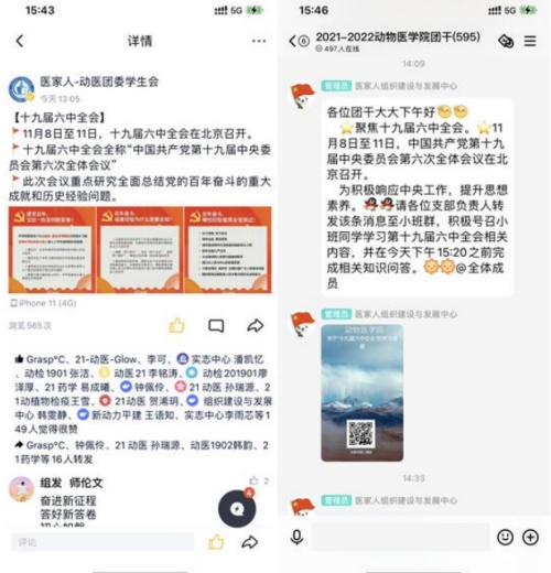 各级团学组织也积极响应号召,以多种方式开展会议精神学习。动物医学院面向全院同学发出积极学习全会精神的倡议,并组织开展线上知识竞答与十九届六中全会专题转发接力活动,参与人数达1393人,系统全面地传达了全会基础知识和实时热点,后续学院还将进行总结,针对性地组织新一轮学习。经济学院为帮助同学更加直观地了解大会内容,创新编绘“图解+漫画”形式,进一步强化学习内容,加深学习印象,提高学习成效。