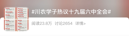 校团委学生融媒体中心利用新媒体平台,在微博、抖音等发起“#川农学子热议十九届六中全会#”话题,累计吸引近3000名同学参与,阅读量破23万人次。同时围绕全会议程、全会意义等内容在QQ空间、“微观川农”微信公众号等平台发布推文,进一步推进宣传。