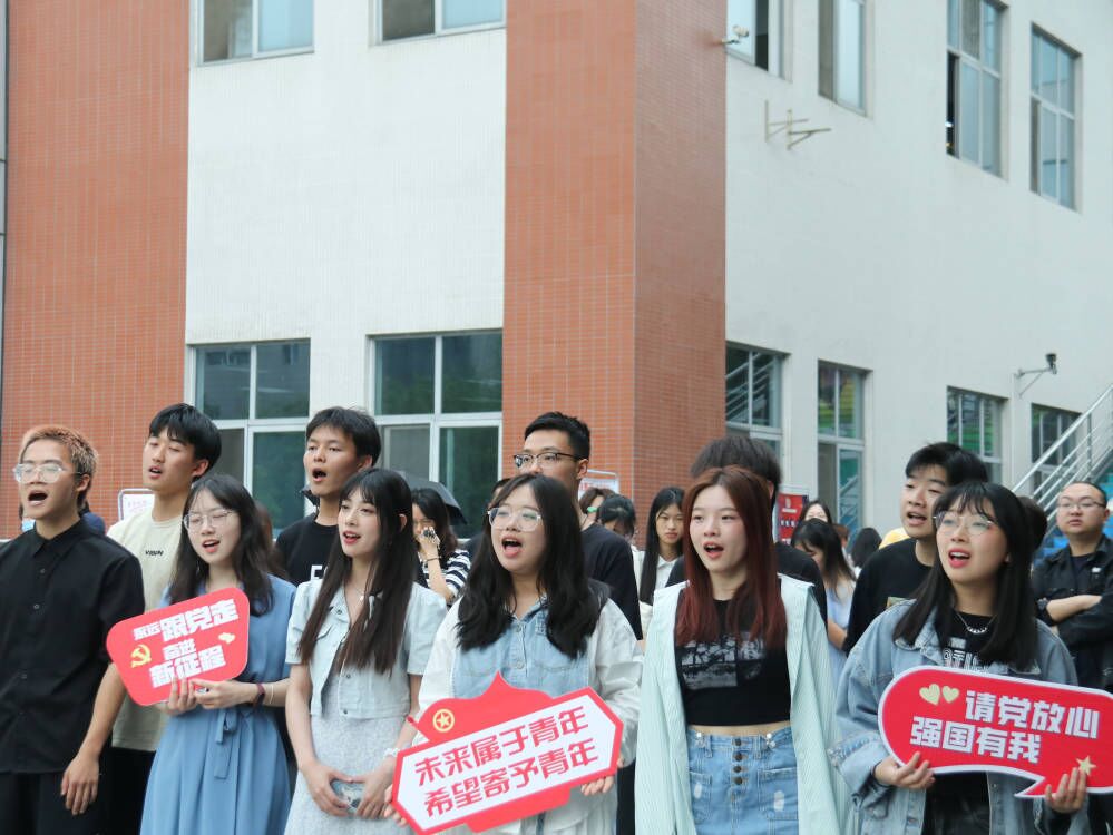 活动现场,同学们手拿“永远跟党走,奋进新征程”“ 请党放心,强国有我”等字样的KT板,随着音乐一起挥舞和呐喊,活动现场一片青春洋溢的火热激情。