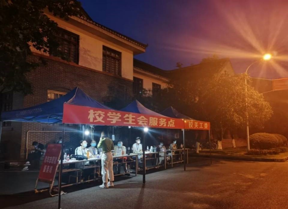 图为疫情防控期间校学生会服务点深夜值班现场