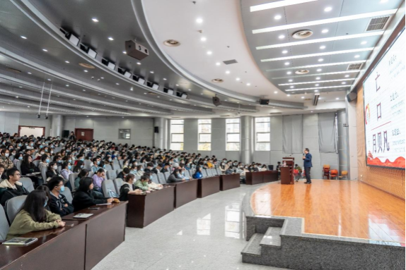 讲座伊始,颜怀坤以“中华民族伟大复兴何以能‘赢’”的“赢”字展开话题,将“赢”字拆分为“亡”“口”“月”“贝”“凡”,立足中华民族伟大复兴历史进程,结合中国共产党在复兴历程中发挥的重要作用,以别出心裁的方式引入了党的二十大提出的新观点、新理论。