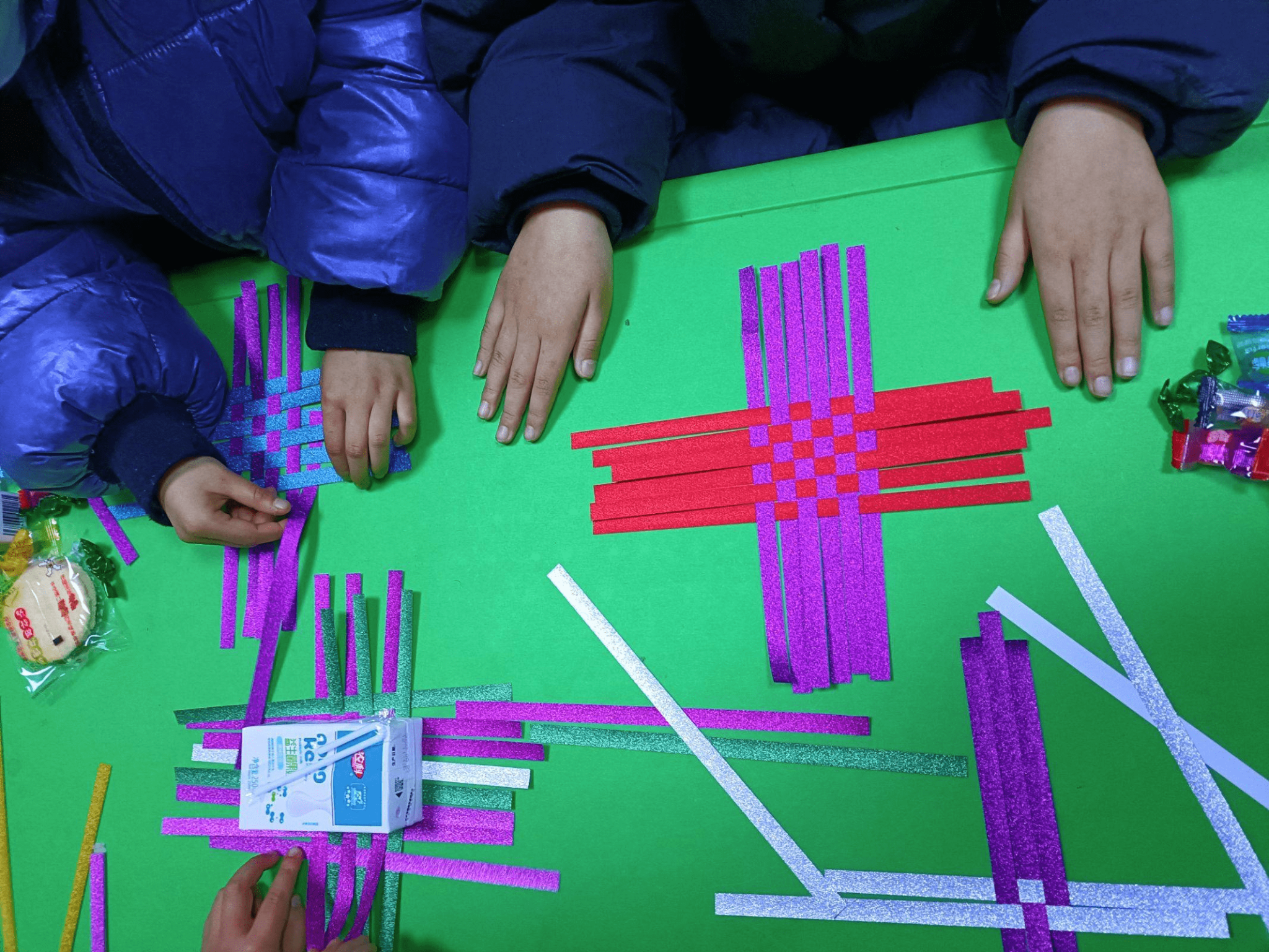 图为团队成员带领小朋友们进行竹编学习