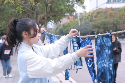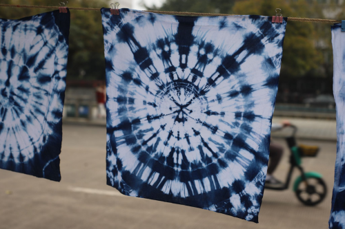 脱胶、捆扎、浸染、氧化、漂洗、晾干......看似简单的几个步骤却蕴含着太多技巧。在现场操作过程中,周老师鼓励同学们尝试各种捆扎方式的组合,大胆展示各种奇思妙想。经过数次反复染色和氧化交替,同学们将染好的布料晾晒在十教前,一幅幅凝聚心血、极具艺术气息的扎染作品呈现在大家眼前,吸引不少师生驻足围观,拍照纪念。“短短一个下午,我深刻感受到扎染是一门智力与体力结合的技艺,仅仅是简单的扎捆动作,同学们也耗费了很大的精力。它凝聚着无数技艺传承人的智慧与创造力,具有独特的艺术魅力。”参加活动的甘茂同学说到。