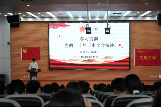 为深入学习贯彻党的二十届三中全会精神,引领广大团员和青年深刻认识党的二十届三中全会的重大意义,由管理学院团委主办,管理学院团委直属部门流动团支部、学生农业经济研讨协会团支部联合承办的“学思践悟 青春筑梦”九月示范性班团活动于9月23日顺利举行。管理学院党委办公室副主任兼团委副书记张婷雯、管理学院主席团成员出席本次活动,并邀请全院新生参与现场观看,累计400余人参与到活动中。