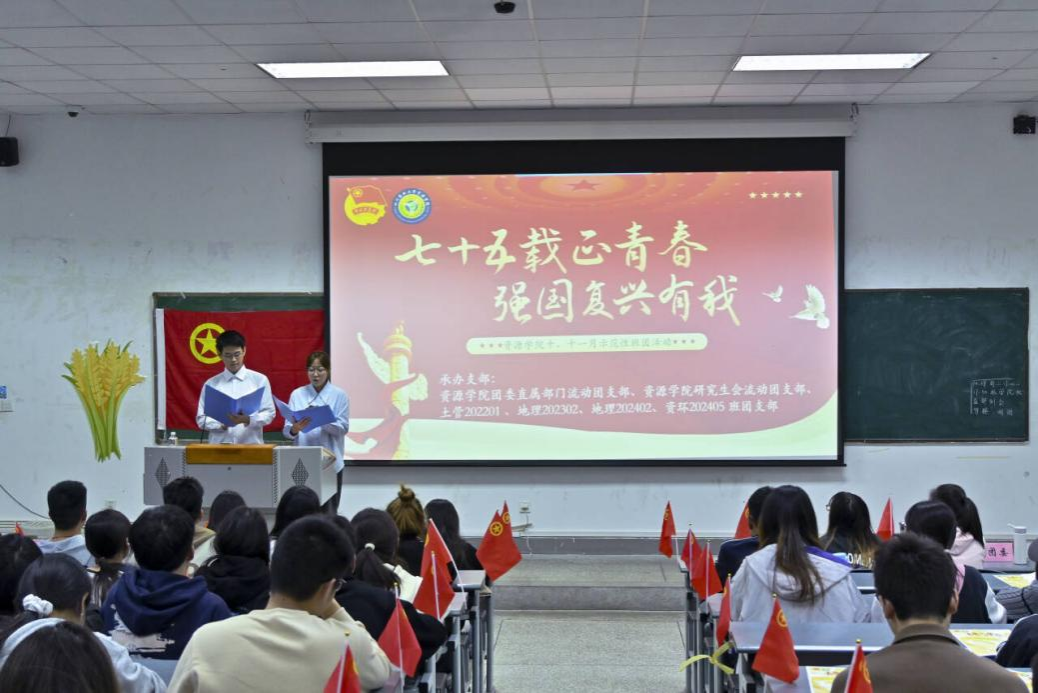 为深入学习宣传贯彻习近平总书记在庆祝中华人民共和国成立75周年招待会上的重要讲话,进一步激发广大青年学生为中国式现代化挺膺担当的使命感和责任感,在新时代新征程上创造出新的更大的辉煌。10月29日下午,资源学院团委直属部门流动团支部、资源学院研究生会流动团支部、土管202201班团支部、地理202302班团支部、地理202402班团支部、资环202405班团支部面向资源学院全体同学开展“七十五载正青春,强国复兴有我”示范性主题班团活动。资源学院党委办公室主任兼团委书记刘丹、资源学院党委办公室副主任兼团委副书记罗小利、资源学院团委学生兼职副书记韩铮等出席本次活动,资源学院第八期团校学员以及团员和青年代表共计200余人共同学习。