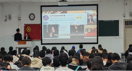 “文化的魅力,超越国界,触动心灵”,随着历史的车轮滚滚向前,中国经济迅猛发展,社会繁荣稳定。本次示范性班团活动通过视频播放的形式,向参与者展示了外国人亲身体验中国的场景,他们感受到了一个科技感十足、活力四射的中国,一个安全和谐、平安喜乐的中国,以及一个包容开放、多元共融的中国。中华文化正吸引着越来越多的国际友人,现场的青年们也不禁心潮澎湃,涌动着强烈的爱国情怀。