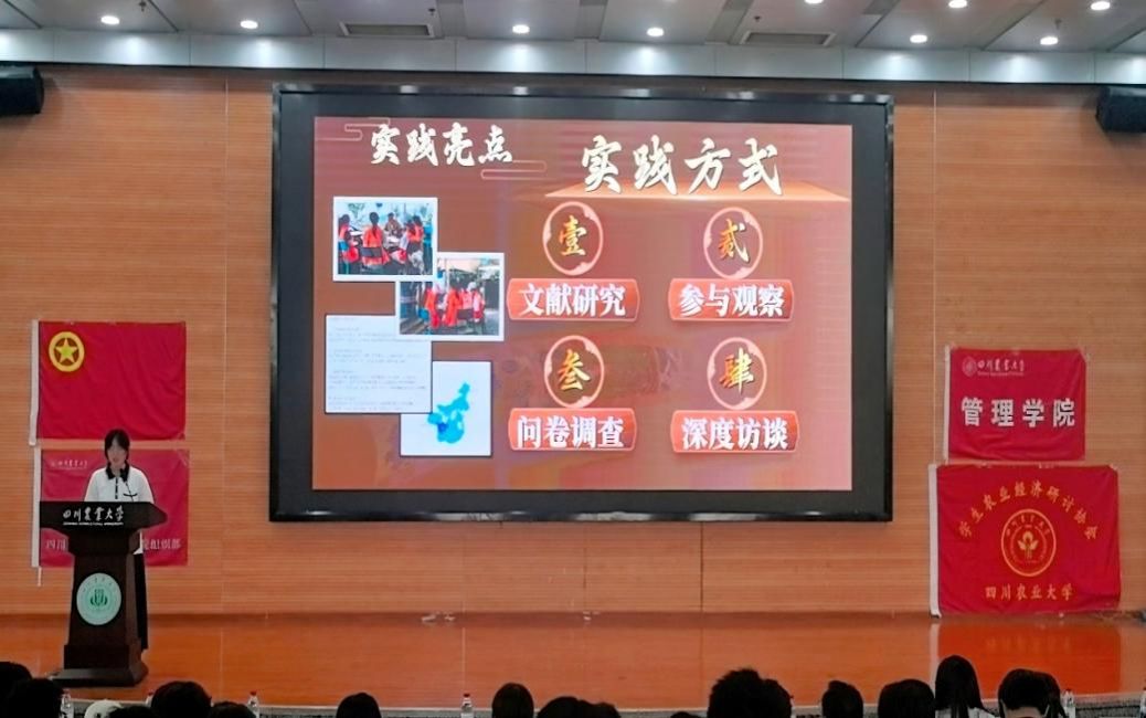 暑假社会实践校级十佳团队——"新火乡传,青贤共治"团队队长张雅铭进行了实践分享。她详细介绍了团队在暑假期间深入基层乡村的实践经历,充分展现了川农学子用专业知识服务基层群众、助力农业农村发展的青春风采与责任担当。