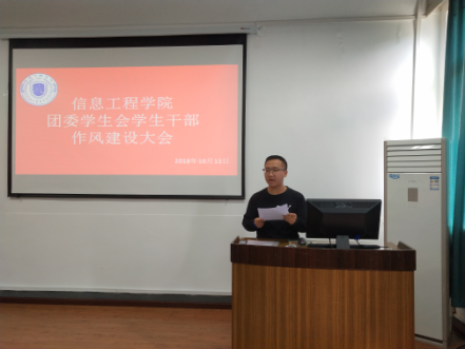 近期,国内部分高校学生组织暴露出“干部思想不正,官本主义突出”等各级学生组织干部作风问题。学院对此高度重视,为对学生会干部思想作风问题有效遏制、防微杜渐,10月15日中午12:30,信息工程学院团干例会暨团委学生会干部作风建设大会在四教210举行,团委办公室黄锎靓、邓秋红、尹华祺,学院主席团、各部门主干人员参加本次大会。