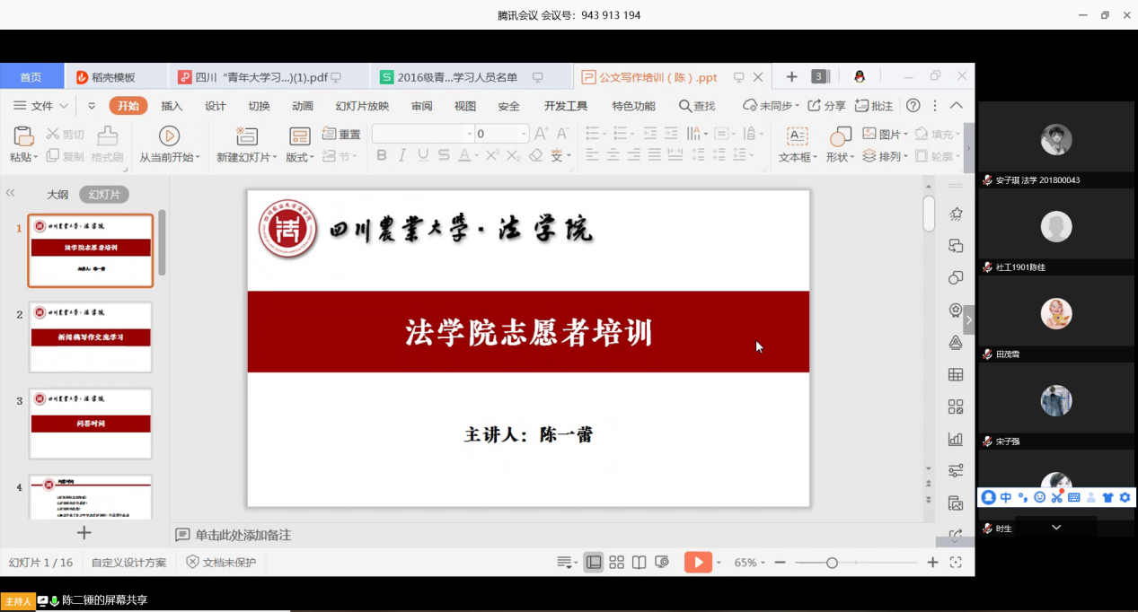 4月23日是第25个“世界读书日”,读万卷书,行万里路,为鼓励青年大学生弘扬读书传统,迎接此次活动到来,3月26日晚,学院利用腾讯会议开展了最后一次线上培训。活动主持人卢同学采取提问的方式,引出此次培训主题,并通过PPT共享,向大家详细推荐数十本世界经典名著,并鼓励大家相互交流自己读过的优秀著作,希望同学们能够“以书本为友,与大师对话”,养成读书,好读书,读好书的良好习惯,同时向大家了推荐“微信读书”、“藏书馆”等实用的读书软件。