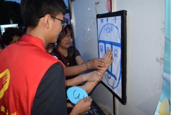 居民参加模拟残障生活的小游戏“盲人摸五官”
