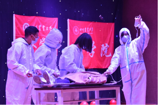 英语202101团支部以一首《春天的故事》诗朗诵回顾了改革开放的历史背景和重要意义;由英语202103团支部带来的情景剧《创业时代》则为大家展示了上世纪90年代,在改革开放大环境下,青年们突破技术关卡,初步实现网络发展与普及,孕育出中国互联网经济的创业故事,鼓励团员青年们积极创新、勤学善思,在新时代有新作为;接着,人力202101团支部联系中国抗疫实践,通过情景剧《感恩有你,山河无恙》再现了疫情爆发伊始,医护人员们不顾个人安危、驰援武汉的情景,赞颂了生命至上、举国同心、舍生忘死、尊重科学、命运与共的伟大抗疫精神。