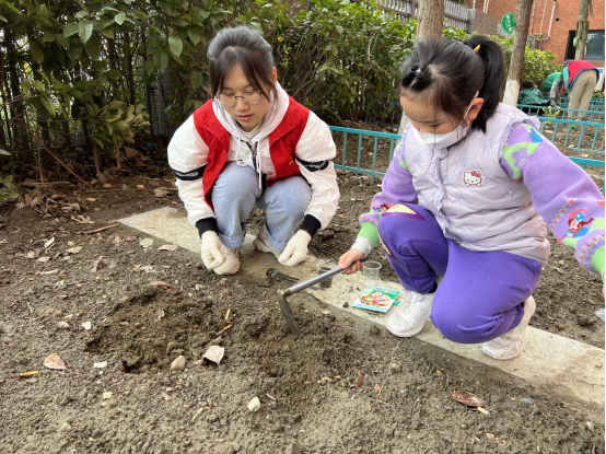 紧接着,志愿者们带领小朋友为班级挑选心仪的蔬菜种子,有五彩辣椒、玻璃白菜、香菜、上海青、南瓜、茄子……“我吃过茄子!可是第一次见到茄子种子。”一位来自二年级的小朋友对志愿者说到。“那你仔细观察一下茄子种子的形状吧。”在志愿者的引导下,小朋友们仔细观察了手中蔬菜种子的特点,回答道:“茄子的种子是黄色的,扁扁的,滑滑的。”在观察过手中的种子后,学院实践与志愿特聘导师陈德炜同学指导大家进行育苗,志愿者帮助小朋友挖土,小朋友将种子种进各自的纸杯里,并将完成育苗的纸杯带回班级,邀请全班同学一起仔细观察和记录发芽状况。