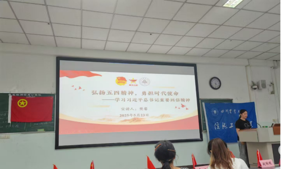 活动以“承五四薪火,悟回信精神”开篇,由校第十一期青马班成员樊馨带领学习“回信精神”专题。她结合科技兴农案例,深入解读习近平总书记对青年“在奋斗中绽放青春光彩”的殷切嘱托,强调青年成长应与国家发展同频共振。此次宣讲弘扬了西部计划精神,引导广大团员“到祖国最需要的地方去”。