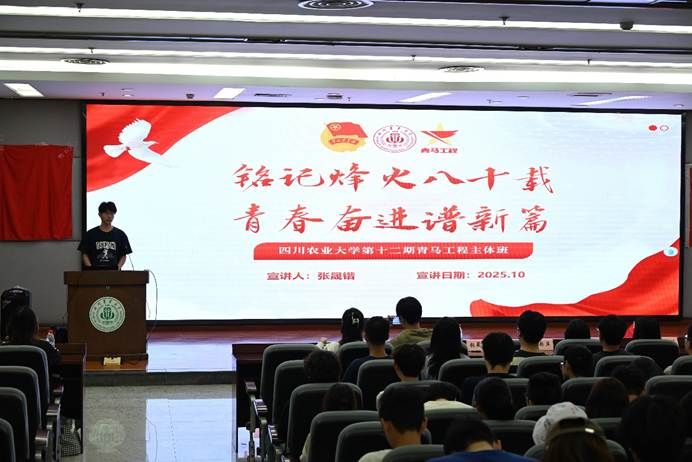 为弘扬伟大抗战精神,激励农科学子将爱国情怀融入强农兴农实践,10月14日,农学院农学202301、智慧农业202301、农学202402、农学202403、智慧农业202401、中草药栽培与鉴定202401六个支部联合举办“纪念中国人民抗日战争暨世界反法西斯战争胜利80周年”示范性班团活动。农学院党委办公室主任兼团委书记唐骄萍、农学院党委办公室副主任兼团委副书记沈丽淘与190余名团员青年共同参与本次红色盛会。