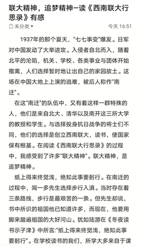 “在阅读《西南联大行思录》的过程中,我感受到了许多‘联大精神’。联大精神,就是追梦精神。”参与者张焱在他的分享中分享自己在了解到西南联大人追逐民族复兴梦的故事,也激起了自己追逐个人梦想,践行中国梦的激情。