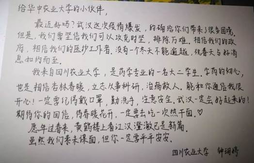 武汉轻工大学的赵璟仪在回信中写道“我依旧像你一样,对中国人能够战胜这场疫情充满自信,期盼在不久的将来,我们能够迎接胜利的曙光。”百封书信架起了川颚学子的“连心桥”,连接起了新时代青年的家国情怀。