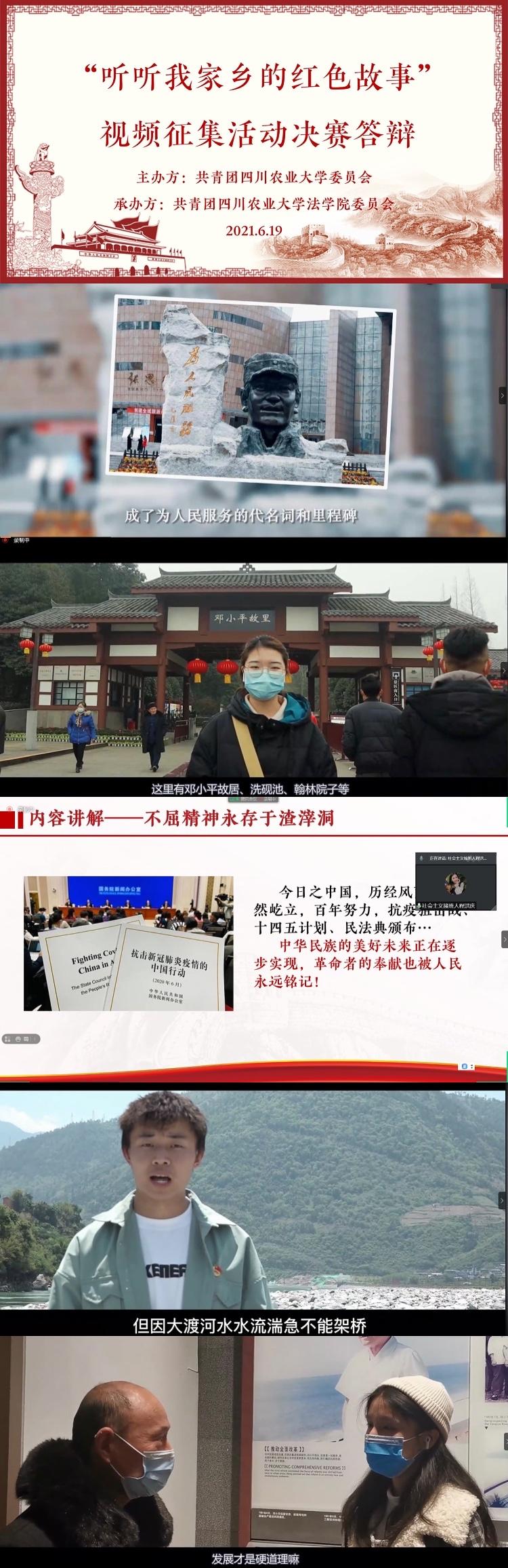 6月19日,由校团委主办,法学院团委承办的“听听我家乡的红色故事”决赛于线上举行。来自19个学院的41支队伍参与,经过初赛与复赛审核,共10支队伍进入决赛。校团委相关老师及法学院三众委员会教师代表们组成评委团,法学院毕业生校友,星河飞鱼影视工作室导演余杭、黄蕾作为特邀嘉宾出席本次活动。
