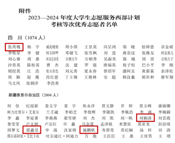 近日,全国大学生志愿服务西部计划项目管理办公室下发《关于印发2023—2024年度大学生志愿服务西部计划考核等次优秀志愿者名单的通知》,我校第25届研究生支教团成员张芮槐、施鹏帆、邵鑫昱、刘颖清4人荣获全国考核优秀等次。