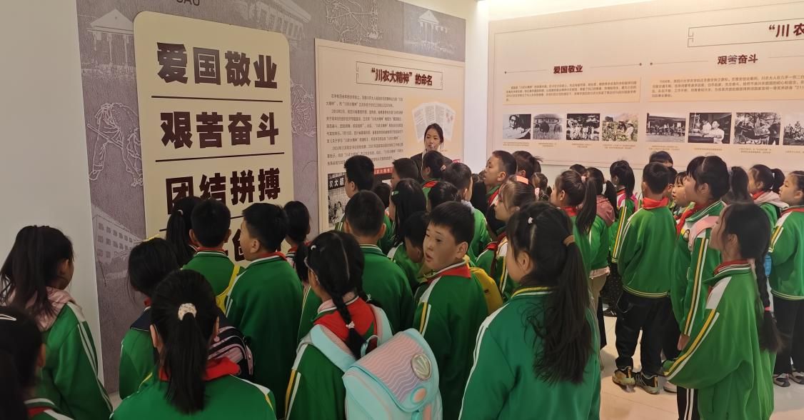 “爱国敬业、艰苦奋斗、团结拼搏、求实创新。”在校史馆和生物标本馆内,三年级二班的同学们仰头齐声诵读着川农大精神。跟随讲解员的脚步,从“迁至雅安独立建院”的峥嵘岁月,到“杨文钰教授带领团队历时23年的攻关成果——大豆玉米带状复合种植技术写入中央一号文件”,孩子们通过泛黄的农垦手稿、斑驳的科研仪器,触摸川农建校百年来“兴中华之农事”的奋斗足迹,深切感受川农大扎根乡土、服务三农的使命担当。