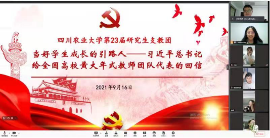 在第三十七个教师节之际,9月16日晚,我校研支团临时党支部通过线上会议,集中学习了习近平总书记给全国高校黄大年式教师团队代表的回信。研支团临时党支部组织委员、第十届研支团雷波分团团长陈璟怡领学回信精神。会上,研支团全体成员认真体悟黄大年式教师团队“学为人师、行为世范”的教师精神,将弘扬高尚师德,潜心立德树人,以赤诚之心、奉献之心、仁爱之心投身教育事业作为教师生涯的行为准则与规范。我校第十届研支团和田分团成员汪年琴分享自己的学习心得:“团中央书记处书记傅振邦同志在致辞中勉励广大研究生支教团志愿者,‘坚守支教初心,主动承担作为,与新时代同向而行’。当代中国青年是与新时代同向同行、共同前进的一代,川农大研支团志愿者们生逢盛世,肩负重任。”