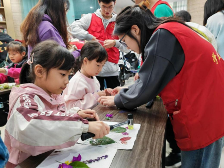 本次体验活动在手工制作的多元实践中晕染文化内涵,在艺术创作的特色活动中彰显匠心底蕴。植物拓染活动以自然为媒,在一番耐心细致地捶打下,花的汁液在棉布侵染成画,70余件布艺作品见证自然与人文的对话;“漆韵生香”工作坊中,小朋友们以扇为纸、以漆为墨,执扇柄在水中轻盈旋转,将水墨意境与几何美学交融,创作出兼具古韵与现代审美的漆扇;“纸上生花”剪纸课堂里,剪刀如同灵动的飞鸟,沿着勾勒的线条游走,伴随着“沙沙”的声响,红纸屑如雪花纷纷扬扬飘落,灯笼的形状初见端倪,展现出民间艺术的独特魅力;中国结编织现场红绳飞舞,丝线时而盘旋升空蛟龙腾空,时而蜿蜒下降如灵蛇游走,吉祥结饰在指尖渐次成型,编织出对美好生活的期许;艾草锤手作体验则巧妙融合中医智慧,参与者亲手炮制的养生器具,成为传统工艺与现代健康理念的生动载体。