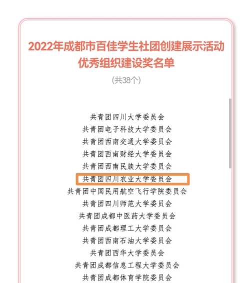 4月20日,由团市委、成都市学联联合开展的2022年成都市百佳学生社团创建展示活动圆满落幕,我校学生环境保护协会、书画协会、农业经济研讨协会获评“成都市百佳学生社团”,王莉淋、解萌、刘燕萍、黄友财、张社梅等5名老师获评“优秀指导教师”,田珊铭、李荣华、王鑫、黄娟、王法麟等5人获评“优秀社团骨干”,校团委获评“优秀组织建设奖”。