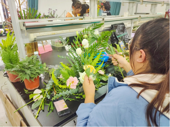 复赛各个队伍携带着提前准备的花材入场。经主持人简短讲述比赛规则后,各小组按照各自初赛中提供的花艺设计稿进行现场制作。比赛有条不紊地进行着,每组成员都在认真思索如何搭配手中的花材,齐心协力组合造型,凸显本次作品主题“忆峥嵘岁月,以花献礼百年”。比赛的气氛和谐轻松,最后所有作品统一置于教室中,等候评委老师点评打分。