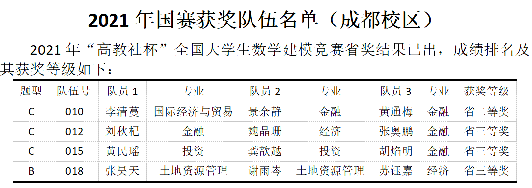 9月28日,从全国大学生数学建模竞赛组委会获悉,2021年高教社杯全国大学生数学建模竞赛成绩揭晓。今年,我校成都校区共组建了10支队伍参赛,我校学子共斩获四川赛区二等奖1项,三等奖3项。