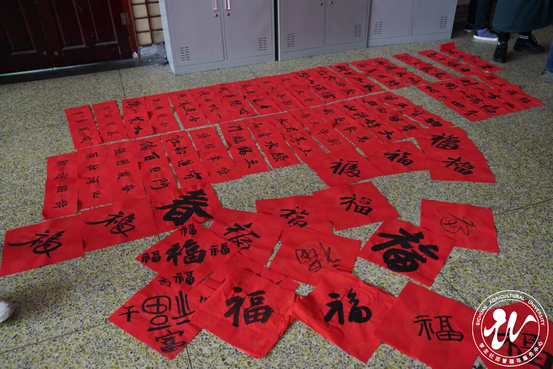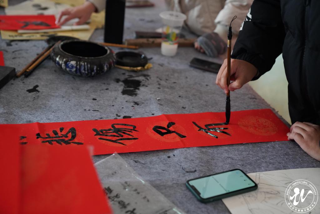 本次活动中,学生书画协会的成员还带来了一场别开生面的书法艺术表演。一张张铺开的红纸之上,协会成员或是屏息以待、缓缓落笔,一行行端庄工整的汉字便映入眼帘,或挥墨如雨,或笔走龙蛇,一个个飘逸灵动“福”字便一气呵成。引人入胜的春联作品展览,搭配上韵味十足的书法表演,为整个现场营造了喜庆祥和、热闹红火的活动氛围,赢得了围观师生的一致好评。
