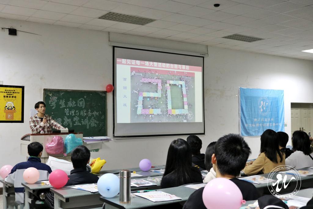 10月13日晚,学生社团管理与服务中心于4A202开展第24届招新宣讲会,与会人员包括学生社团管理与服务中心主席团、六大直属部门主干和百余新生。青听川农官方微博平台同步进行线上直播,共计800余人在线观看。