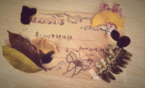 “这封信像是我与未来的一场秘密对话,落叶让它更有仪式感。我想告诉自己,到了2025年,无论是否实现了目标,都要保持内心的宁静与平衡,让心灵持续充实。”来自林学院的钟佳欣用落叶装饰给2025年自己的信。