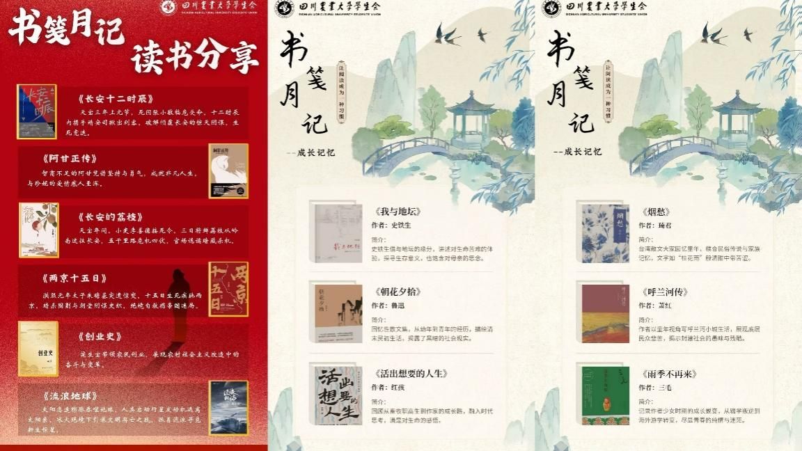 农学院“读书之星”21天阅读打卡、园艺学院、人文学院、信息工程学院、公共管理学院“早安川农”早读打卡、土木工程学院的“书香满校园,悦读伴成长”、艺术传媒学院“德润青春,书韵晨读”等系列打卡活动、在培养同学们阅读习惯的同时,提升自主学习能力与文学素养;资源学院的“红色经典读书月”、动物医学院的“悦”读心旅系列活动、理学院的“阅读马拉松”、经济学院的“妙笔生花”活动、食品学院“书笺月记”主题阅读活动、生命科学学院“生命之书,典籍之光”——生物名著阅读,建筑与城乡规划学院“月读新篇,笔述心声”活动以同学阅读习惯为始,又激励同学们将前期阅读所获,以不同媒介表达出来,活化书本内容;水利水电学院“书海拾贝·以书为友”的读书分享会让同学们在书写中感受文字温度,在交流中碰撞思想火花,让经典作品焕发新生命力。