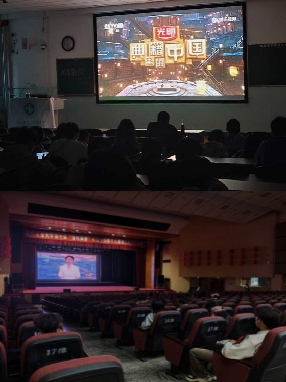 校学生会通过“影文润心”观影活动、“经典重映”经典文学再现系列活动,组织同学们线下观看《中国诗词大会》、《典籍里的中国》等文化类节目,观影现场气氛热烈,同学们在同频为节目中的主人公喝彩的同时,感悟先贤对书籍的珍视和对文化的追求。