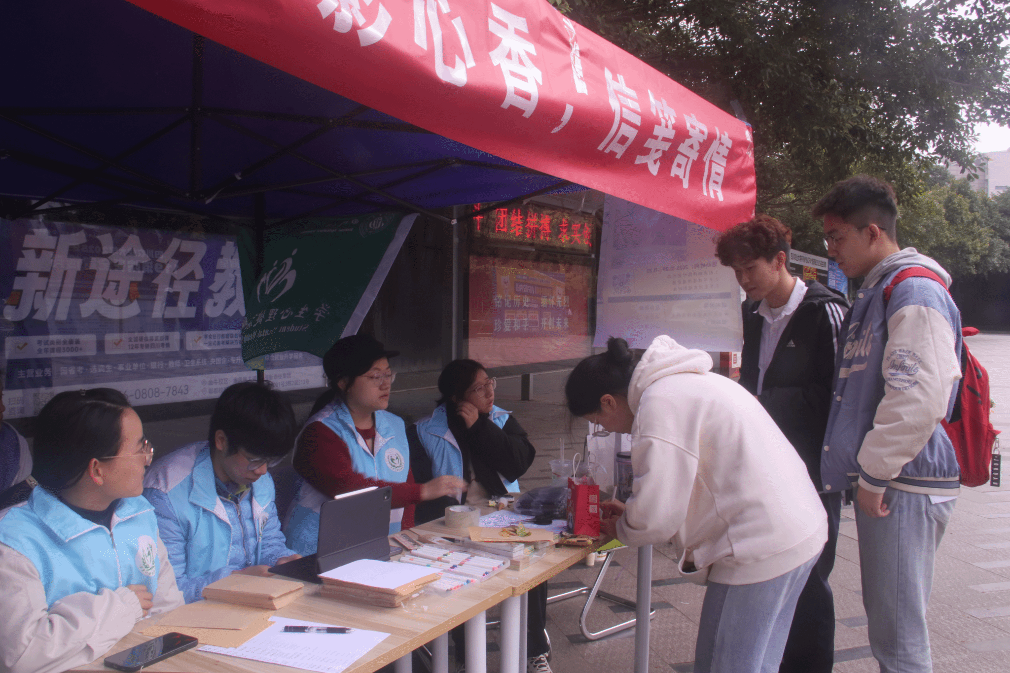 11月8日,“叶影心香,信笺寄情”手写信活动在成都食堂小广场、雅安二区主干道、都江堰石碑处进行线下设点,累计收到手写信500余份。
