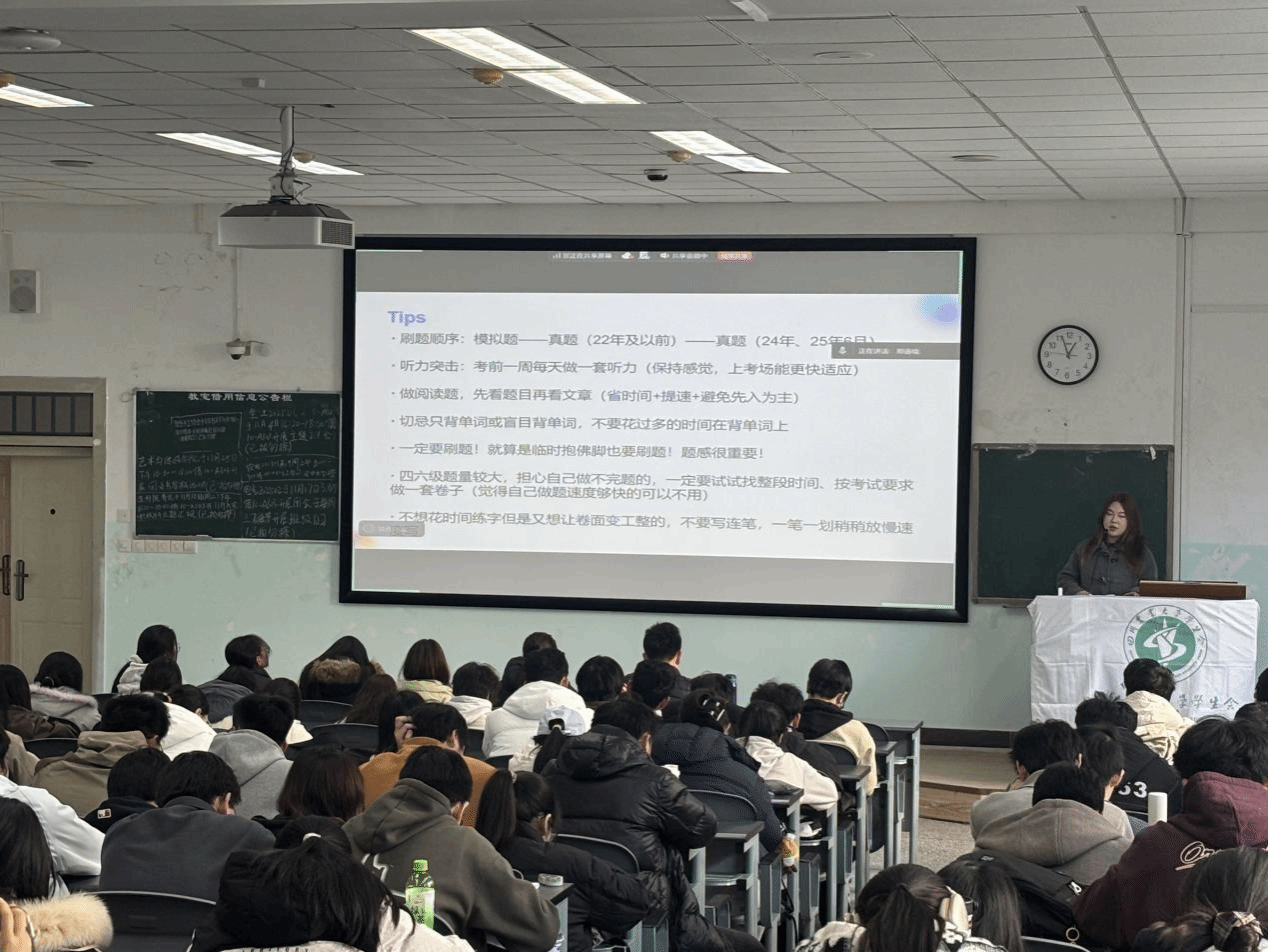 本次讲座邀请各校区优秀学长学姐担任分享嘉宾,结合自身实战经验倾囊相授。雅安校区法学院张一涵同学聚焦应试实用技巧,从题型拆解、答题思路等方面展开细致讲解;成都校区农学院刘泓延同学着重强调考前规划与考中时间分配的核心要点,助力学子科学安排备考节奏;都江堰校区商旅学院冯柯、黄鑫两位同学则围绕英语能力提升对个人发展的长远意义,搭配高效备考策略进行分享,为同学们提供全方位指导。