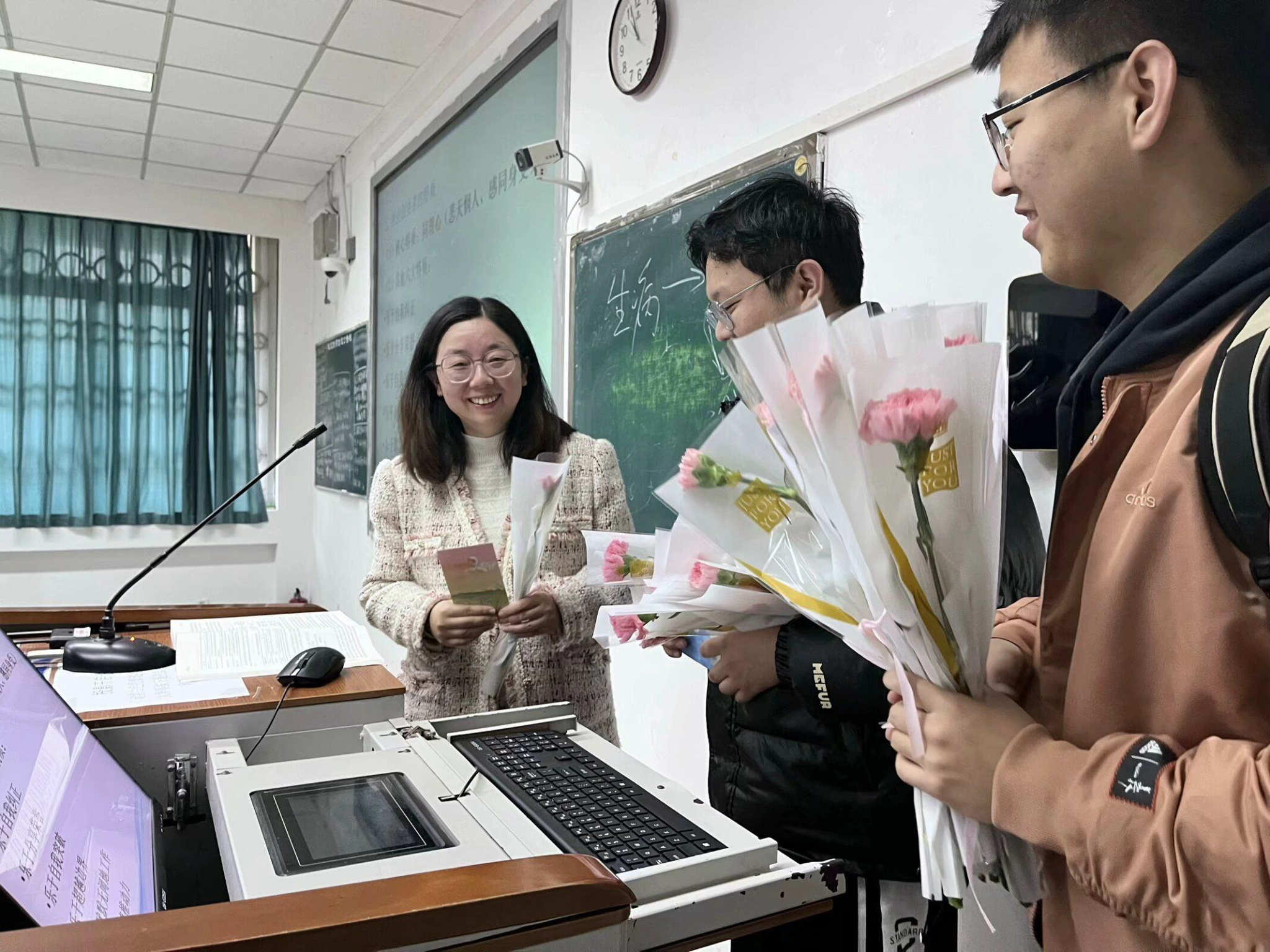 “好漂亮的花!谢谢同学们的祝福,太有爱啦!”宿舍管理二科的黄珍老师在收到鲜花后开心地说道;“感谢孩子们的鲜花,真的很暖心”校园超市的魏小琼阿姨表示;“刚刚在群里看到有老师在‘炫耀’鲜花,没过一会我也收到了。谢谢同学们!”林学院的陈琦老师在收到祝福后感动地说道。