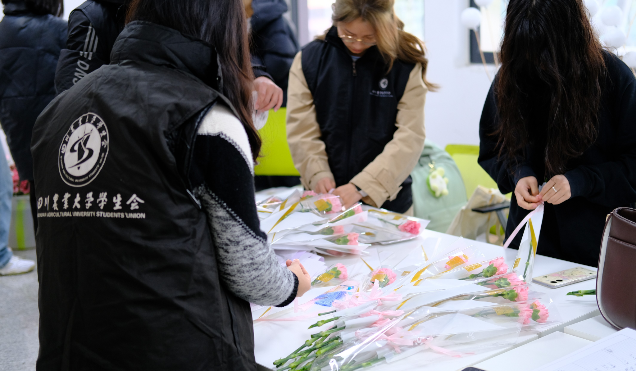 图为校学生会工作人员包装花束