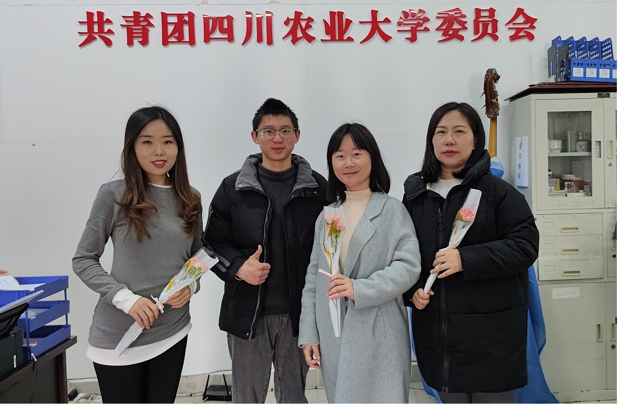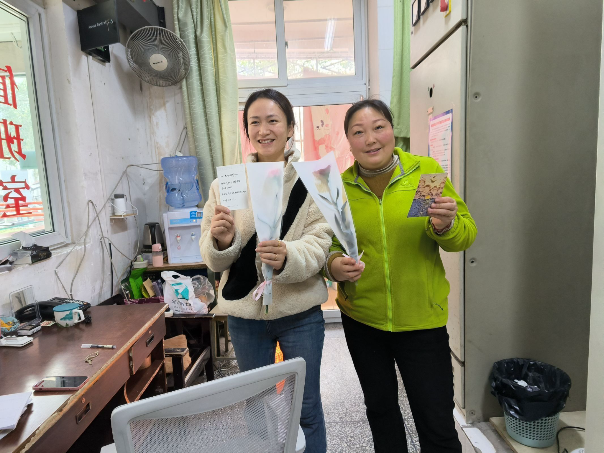 图为宿舍值班室的女性职工收到鲜花