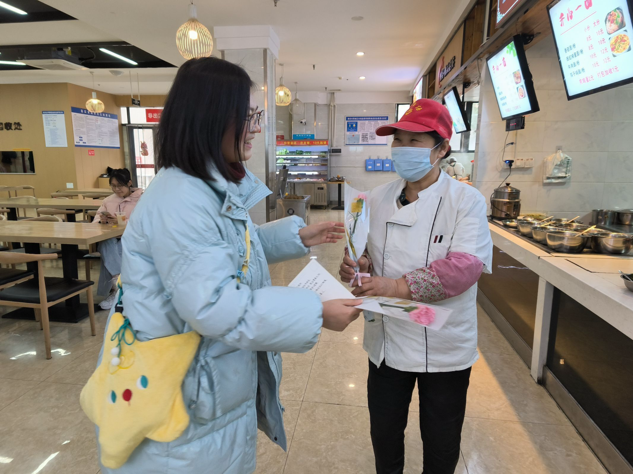 图为校学生会工作人员为食堂工作人员送上鲜花
