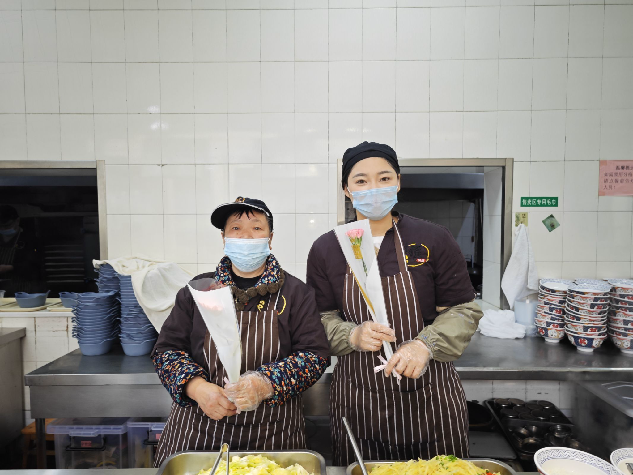 图为食堂的女性职工收到鲜花