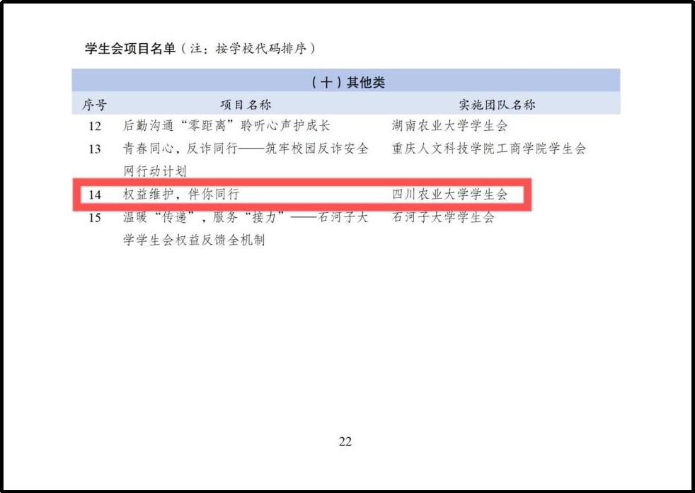 近日,由共青团中央指导、全国学联主办的全国高校学生会组织“我为同学做实事”项目交流展示活动落下帷幕,我校学生会“权益维护,伴你同行”项目成功入选全国项目交流展示名单,我省仅四川大学、西南交通大学等5个本科学生会项目入选。