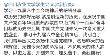“我们是新时代的青年大学生,生在祖国富强、人民幸福的美好时代,这个美好时代也对我们提出更高的要求,我们应深刻领会全会精神,不忘昨天苦难辉煌,无愧今天使命担当,不负明天伟大梦想,在新时代新征程中展现新气象实现新作为,用实际行动书写更加绚丽的篇章。”同学们在微博纷纷晒出自己对全会精神的感悟。