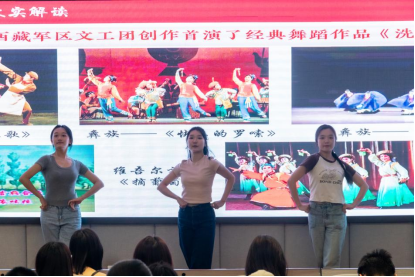 正式讲座中,李老师从时间维度出发,深入剖析中国舞蹈艺术发展历程。第一阶段,新中国成立后舞蹈艺术实现从无到有质的飞跃,如《宝莲灯》《鱼美人》等舞剧诞生,四川艺术代表团《百鸟朝凤》,展现出蓬勃朝气;第二阶段,芭蕾舞、当代舞、艺术民间舞发展,《老两口送饭》《野营路上》等作品,在特殊时代留下独特印记;第三阶段,随着文化交流大门敞开,中国舞蹈大胆探索、不拘一格,不断吸收创新;第四阶段,当代中国舞蹈向艺术高峰迈进,建立起自主审美体系,以斩获“荷花奖”“文华奖”等为标志,展现出独步全球的文化自信。讲座现场,李炜老师通过丰富的图片、视频资料,生动呈现各阶段经典舞蹈作品,同时结合时代背景、文化思潮,深度解读作品内涵、艺术特色及在中国舞蹈史上的意义价值。讲座最后还邀请学生舞蹈团同学为大家现场展示蒙古舞和维吾尔族舞经典动作,在场师生们沉浸其中,报以热烈掌声。
