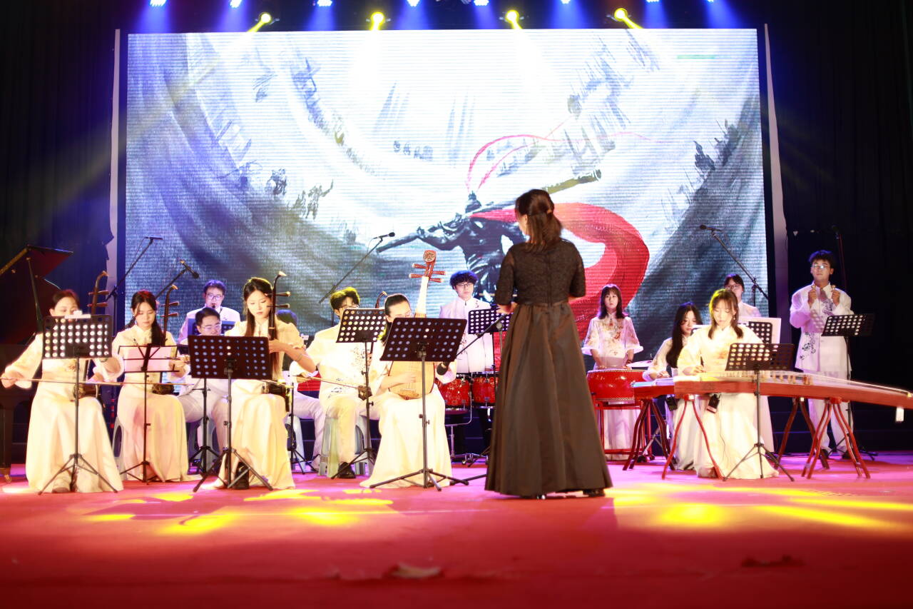 本次专场以民乐合奏《云宫迅音》拉开帷幕,经典名著悟空形象呼之欲出;《象王行》雄浑厚重,竹笛演奏层层递进间彰显出华夏的盛世威仪;琵琶与鼓合奏的《霸王卸甲》音韵铿锵,凸显了项羽刚柔并济的英雄形象;各类器乐重奏婉转悠扬,在《神话》《天鹅》《渔舟唱晚》的旋律里铺展出古韵今声的对话。混声合唱《裹着心的光》《乌兰巴托的夜》纯净炽热,传递出温暖而又震撼的力量;层次丰富的小合唱《蒲公英》通过四声部复调的交错叠进,以舒缓飘逸的旋律引观众屏息聆听。本次专场还特别邀请2025届毕业生助演。演出尾声,现场演员与观众,台上台下齐唱《海阔天空》,舞动的手臂与满含深情的歌声为毕业生们送上一份海阔天空任鸟飞的憧憬与祝福!