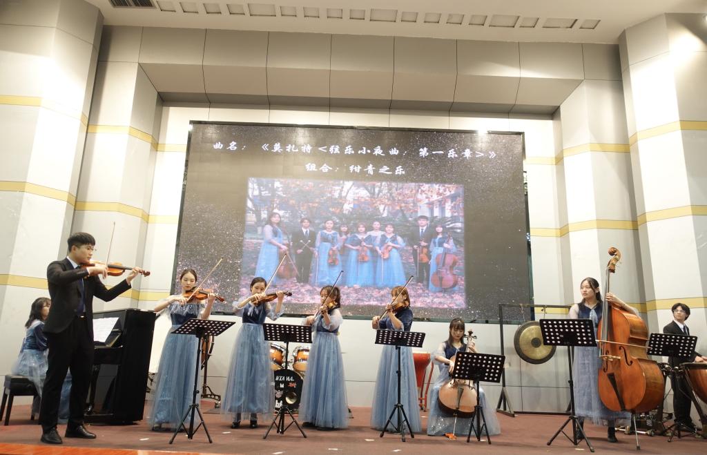 雅安校区复赛阶段,室内乐团共有六支队伍参加,经过激烈的拼搏,两支队伍成功入围决赛。本次决赛共计12个曲目,最终,绀青之乐组合的重奏《莫扎特小夜曲》荣获一等奖,小提琴独奏《渔舟唱晚》荣获三等奖。