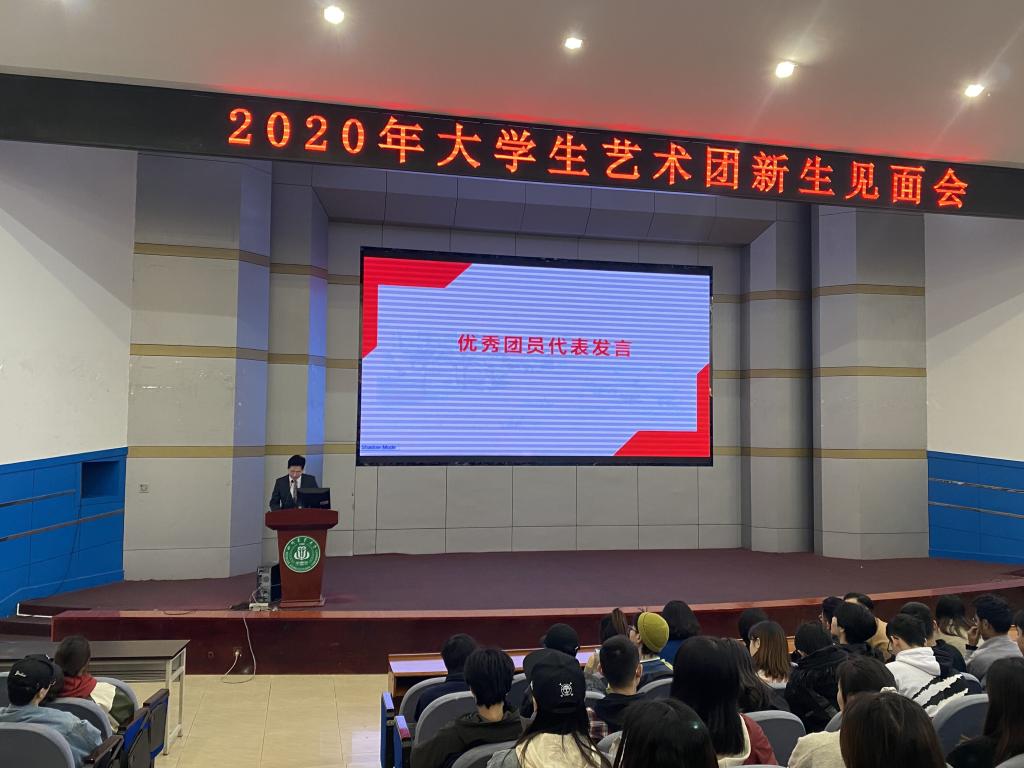 首先,艺术团优秀团员代表赵李同学发言,感慨到通过大学四年充实的艺术团学习使自己走向了更大更广阔的平台,并鼓励新同学们在艺术团能找到属于自己的一条道路。接下来,新生代表王正良发言,讲述了入团到现在的心路历程,并展望未来,呼吁大家能和自己一样坚持热爱,为艺术团贡献自己的力量。随后校团委相关老师代表发言,从艺术团的建制和师资等各个方面详细的介绍了艺术团。会议的最后,校团委副书记赵野逸老师,通过讲述自己在川农的心路历程,鼓励新生在艺术团珍惜平台和机会,希望新成员能够不忘初心,日后在艺术团发光发热。