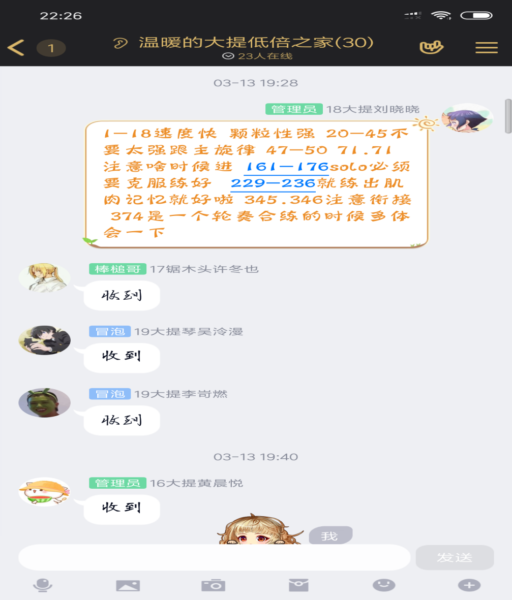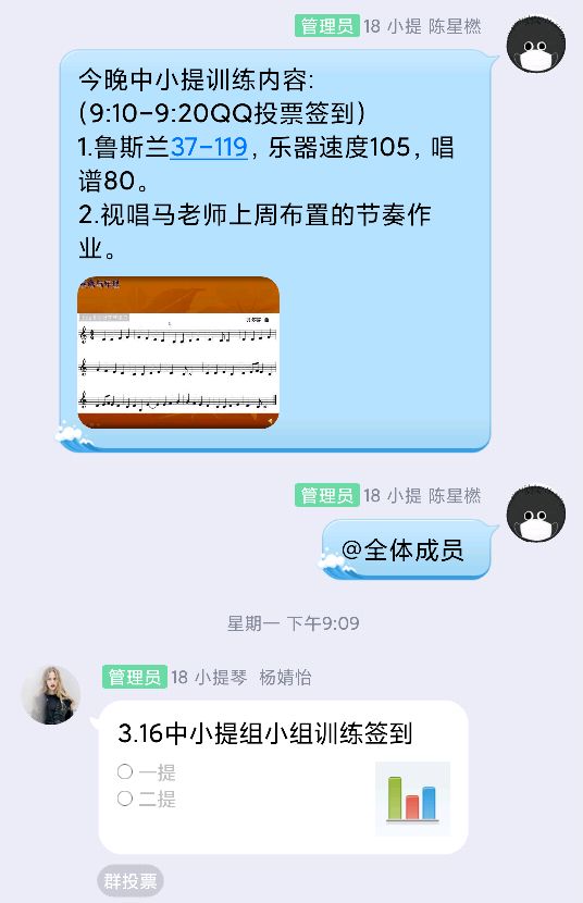自全团乐理课教授完毕后,各声部在组长、首席的组织下,有条不紊的如期开展了线上训练。开课前,以团长为首带领主干们在线集体备课。共同讨论训练方式方法的同时和团内成员保持充分沟通交流,及时反馈收获的建议,制定最优教案。上下协同,全面保障线上训练的可行性与有效性。