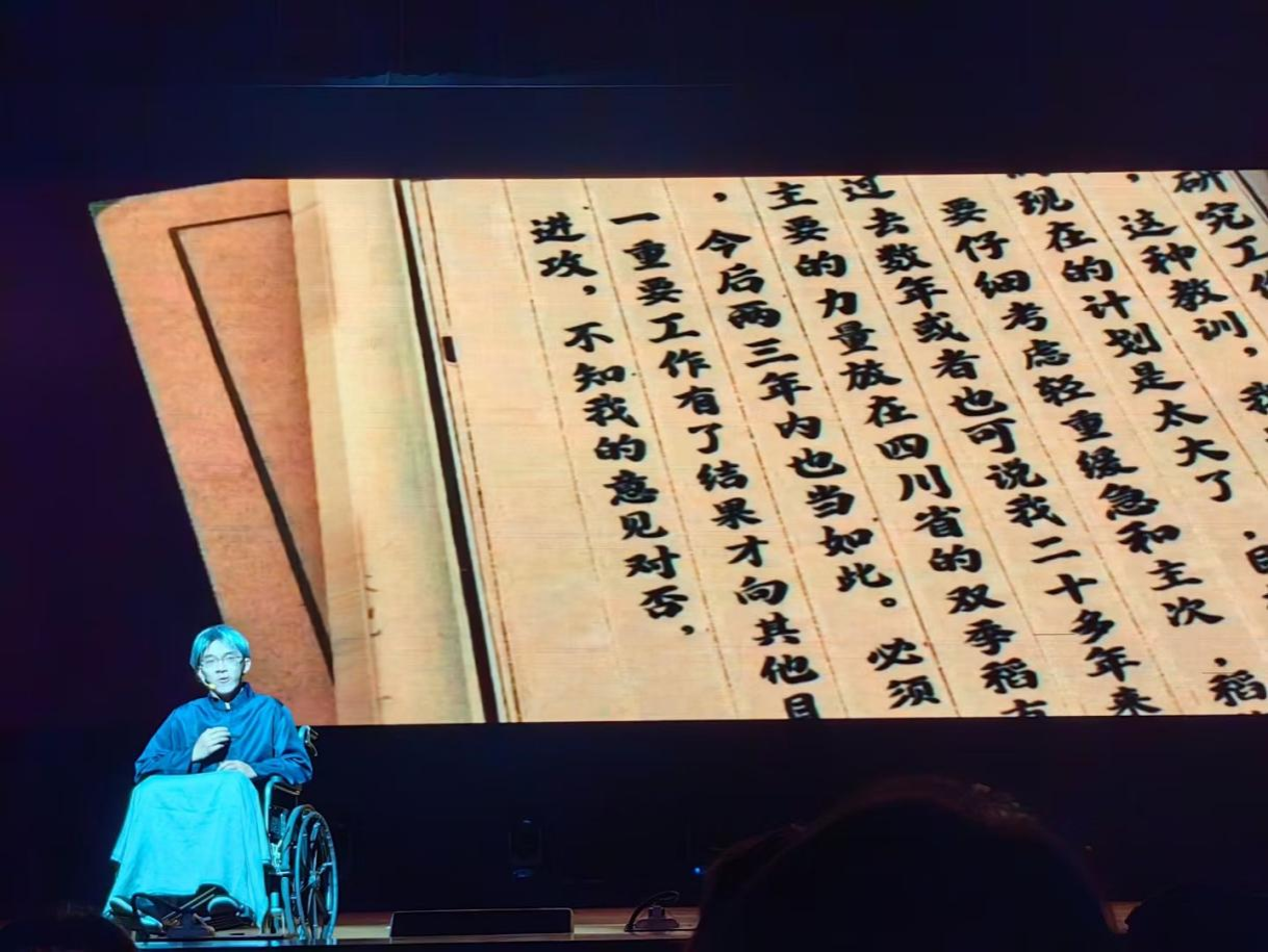 第二篇章“流金时代”重点展现了川农学者“把论文写在大地上”的生动事迹,彰显出“川农大精神”的时代内涵。朗诵《顽石之语》演绎了水稻科学家杨开渠教授在生命尽头仍卧榻书信,寄语青年的殷殷嘱托之情。朗诵《菽玉良缘》讲述杨文钰教授带领团队,历时23年攻关“大豆玉米带状复合种植技术”,为国家粮油安全贡献川农力量的感人事迹。朗诵《难忘时刻》重现了2022年6月习近平总书记来川视察时,我校水稻专家马均教授向习近平总书记汇报“实现藏粮于技、中国碗装中国粮,我们有信心、有底气!”的动人时刻。一幕幕川农人的奋斗事迹在舞台上还原重现,浸润式推动信仰的种子在同学们心中扎根,唤醒新时代川农青年不忘初心、勇担使命的红色血脉。